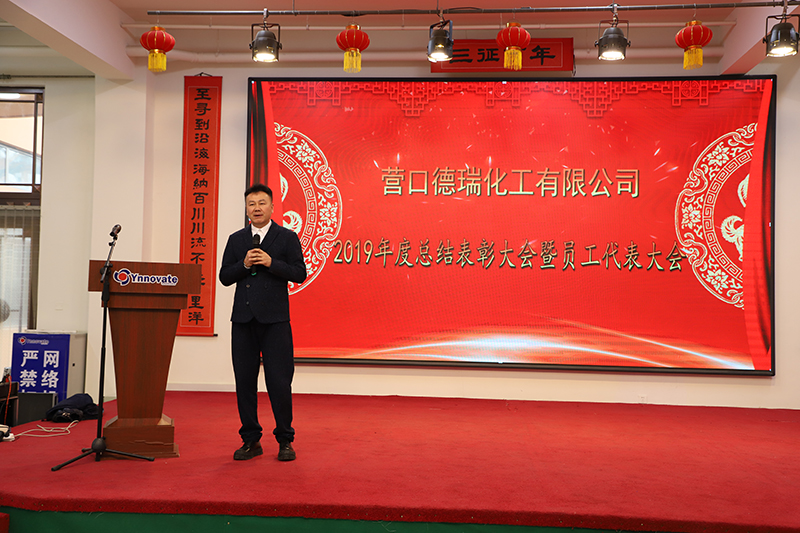 2020年1月22日上午9:00,營口德瑞化工有限公司2019年度總結(jié)表彰大會暨員工代表大會在員工食堂隆重召開,“三征”創(chuàng)始人劉慶晨教授,盛海投資董事長、營創(chuàng)三征黨委書記劉至尋先生,營新科技生產(chǎn)總監(jiān)劉健先生,營創(chuàng)三征行政總監(jiān)商富麗女士,營創(chuàng)三征ESH總監(jiān)齊長亮先生,德瑞化工全體管理層及員工代表,共計150余人出席了大會,公司副總經(jīng)理周永強先生主持會議。
